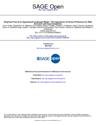 Cooke, I. R., Mattison, E. H. A., Audsley, E., Bailey, A. P., Freckleton, R. P., Graves, A. R., Morris, J., Queensborough, S. A., Sanders, D. L., Siriwardena, G. M., Trawick, P., Watkinson, A. R. and Sutherland, W. J. (2013) Empirical test of an agricultural landscape model: the importance of farmer preference for risk aversion and crop complexity. Sage Open, 3 (2). ISSN 2158-2440 doi: 10.1177/2158244013486491