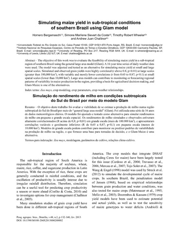 Bergamaschi, H., da Costa, S. M. S., Wheeler, T. and Challinor, A. J. (2013) Simulating maize yield in sub-tropical conditions of southern Brazil using Glam model. Pesquisa Agropecuária Brasileira, 48 (2). pp. 132-140. ISSN 1678-3921 doi: 10.1590/S0100-204X2013000200002
