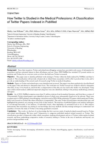 Williams, S., Terras, M. and Warwick, C. (2013) How Twitter is studied in the medical professions: a classification of Twitter papers indexed in PubMed. Medicine 2.0, 2 (2). e2. ISSN 1923-2195 doi: 10.2196/med20.2269