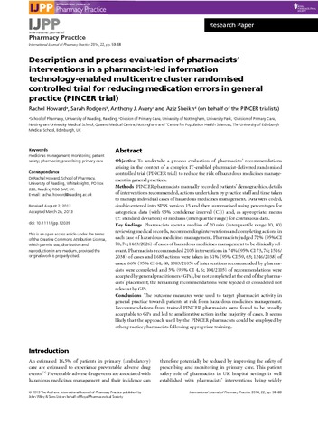 Howard, R., Rodgers, S., Avery, A. J. and Sheikh, A. (2013) Description and process evaluation of pharmacists’ interventions in a pharmacist-led information technology-enabled multicentre cluster randomised controlled trial for reducing medication errors in general practice (PINCER trial). International Journal of Pharmacy Practice, 22 (1). pp. 59-68. ISSN 0961-7671 doi: 10.1111/ijpp.12039