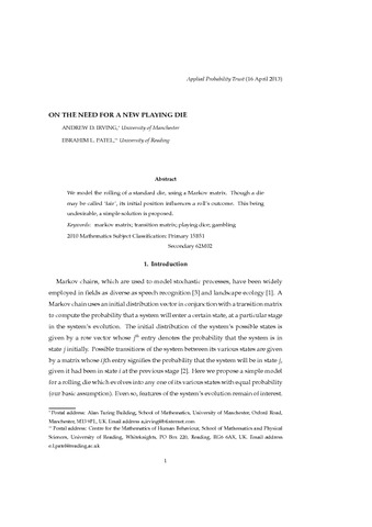 Irving, A. D. and Patel, E. L. (2014) On the need for a new playing die. Mathematical Scientist, 39 (1). ISSN 0312-3685