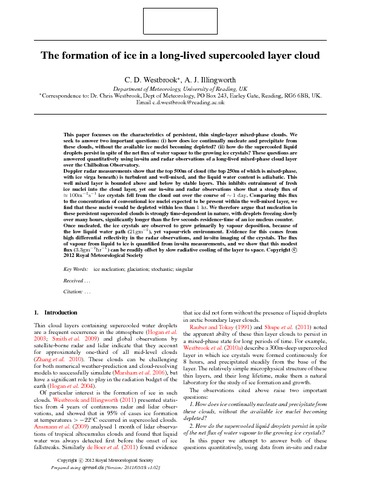 Westbrook, C. D. orcid id iconORCID: https://orcid.org/0000-0002-2889-8815 and Illingworth, A. J. orcid id iconORCID: https://orcid.org/0000-0002-5774-8410 (2013) The formation of ice in a long-lived supercooled layer cloud. Quarterly Journal of the Royal Meteorological Society, 139 (677). pp. 2209-2221. ISSN 1477-870X doi: 10.1002/qj.2096