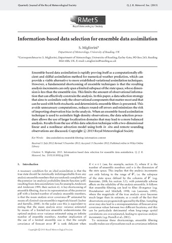 Migliorini, S. (2013) Information-based data selection for ensemble data assimilation. Quarterly Journal of the Royal Meteorological Society, 139 (677). pp. 2033-2054. ISSN 1477-870X doi: 10.1002/qj.2104