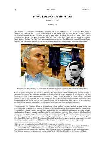 | Uncontrolled Keywords | AI, automated theorem proving, cheating, chess, computer chess, Kasparov, machine learning, Manchester, Turing, Turing 100, Watson |