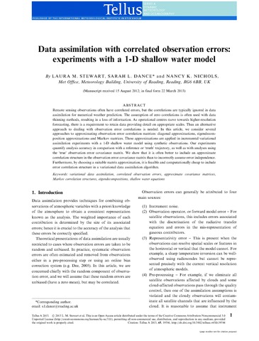 Stewart, L. M., Dance, S. orcid id iconORCID: https://orcid.org/0000-0003-1690-3338 and Nichols, N. K. orcid id iconORCID: https://orcid.org/0000-0003-1133-5220 (2013) Data assimilation with correlated observation errors: experiments with a 1-D shallow water model. Tellus A, 65. 19546. ISSN 1600-0870 doi: 10.3402/tellusa.v65i0.19546