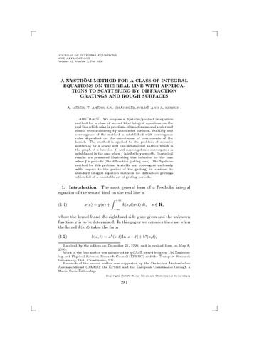 A Nyström method for a class of integral equations on the real line with applications to scattering by diffraction gratings and rough surfaces.