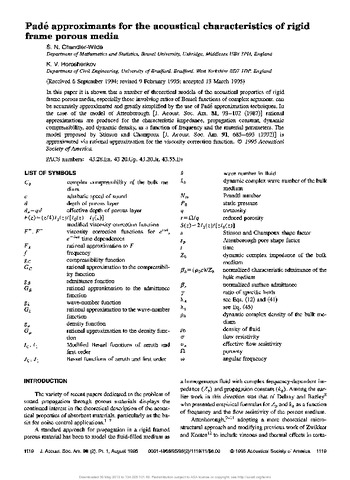 In this paper it is shown that a number of theoretical models of the acoustical properties of rigid frame porous media, especially those involving ratios of Bessel functions of complex argument, can be accurately approximated and greatly simplified by the use of Padé approximation techniques. In the case of the model of Attenborough [J. Acoust. Soc. Am. 81, 93–102 (1987)] rational approximations are produced for the characteristic impedance, propagation constant, dynamic compressibility, and dynamic density, as a function of frequency and the material parameters. The model proposed by Stinson and Champoux