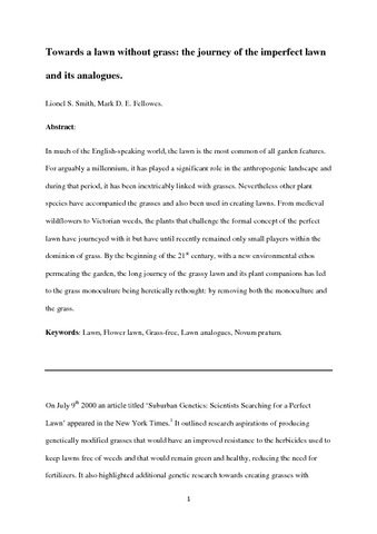 In much of the English-speaking world the lawn is the most common of all garden features. For arguably a millennium it has played a significant role in the landscape and during that period it has been inextricably linked with grasses. Nevertheless other plant species have accompanied the grasses and also been used in creating lawns. From medieval wildflowers to Victorian weeds, the plants that challenge the formal concept of the perfect lawn have journeyed with it but have until recently remained only small players within the dominion of grass. By the beginning of the 21st century, with a new environmental ethos permeating the garden, the long journey of the grassy lawn and its plant companions has led to the grass monoculture being heretically rethought: by removing both the monoculture and the grass.