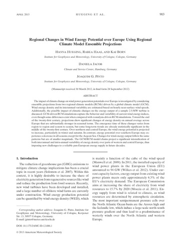 Hueging, H., Haas, R., Born, K., Jacob, D. and Pinto, J. G. (2013) Regional changes in wind energy potential over Europe using regional climate model ensemble projections. Journal of Applied Meteorology and Climatology, 52 (4). pp. 903-917. ISSN 1558-8432 doi: 10.1175/JAMC-D-12-086.1