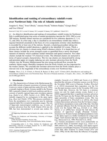 Pinto, J. G., Ulbrich, S., Parodi, A., Rudari, R., Boni, G. and Ulbrich, U. (2013) Identification and ranking of extraordinary rainfall events over northwest Italy: the role of Atlantic moisture. Journal of Geophysical Research, 118 (5). pp. 2085-2097. ISSN 0148-0227 doi: 10.1002/jgrd.50179