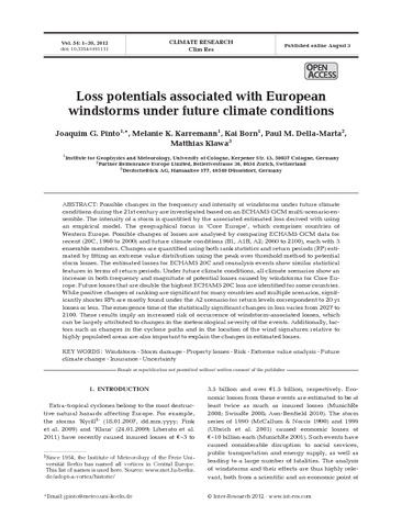 Uncontrolled Keywords Windstorm · Storm damage · Property losses · Risk · Extreme value analysis · Future climate change · Insurance · Uncertainty