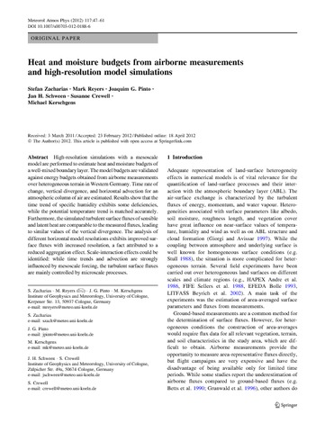 Zacharias, S., Reyers, M., Pinto, J. G., Schween, J. H., Crewell, S. and Kerschgens, M. (2012) Heat and moisture budgets from airborne measurements and high-resolution model simulations. Meteorology and Atmospheric Physics, 117 (1-2). pp. 47-61. ISSN 1436-5065 doi: 10.1007/s00703-012-0188-6