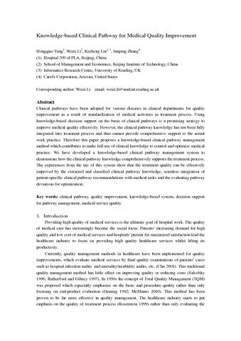 Yang, H., Li, W. orcid id iconORCID: https://orcid.org/0000-0003-2878-3185, Liu, K. and Zhang, J. (2012) Knowledge-based clinical pathway for medical quality improvement. Information Systems Frontiers, 14 (1). pp. 105-117. ISSN 1572-9419 doi: 10.1007/s10796-011-9307-z