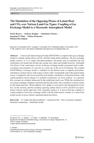 Reyers, M., Krüger, A., Werner, C., Pinto, J. G., Zacharias, S. and Kerschgens, M. (2011) The simulation of the opposing fluxes of latent heat and CO2 over various land-use types: coupling a gas exchange model to a mesoscale atmospheric model. Boundary-Layer Meteorology, 139 (1). pp. 121-141. ISSN 1573-1472 doi: 1007/s10546-010-9574-0