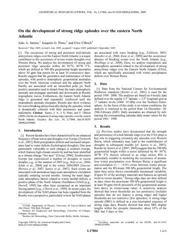 Santos, J. A., Pinto, J. G. and Ulbrich, U. (2009) On the development of strong ridge episodes over the eastern North Atlantic. Geophysical Research Letters, 36 (17). L17804. ISSN 0094-8276 doi: 10.1029/2009GL039086