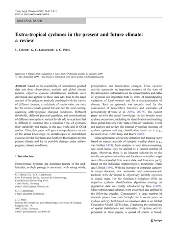 Ulbrich, U., Leckebusch, G. C. and Pinto, J. G. (2009) Extra-tropical cyclones in the present and future climate: a review. Theoretical and Applied Climatology, 96 (1-2). pp. 117-131. ISSN 1434-4483 doi: 10.1007/s00704-008-0083-8