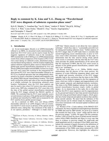 Murphy, K. R., Rae, I. J., Mann, I. R., Walsh, A. P., Milling, D. K., Watt, C. E. J., Ozeke, L., Frey, H. U., Angelopoulos, V. and Russell, C. T. (2009) Reply to comment by K. Liou and Y.-L. Zhang on 'Wavelet-based ULF wave diagnosis of substorm expansion phase onset'. Journal of Geophysical Research, 114. A10207. ISSN 0148-0227 doi: 10.1029/2009JA014351