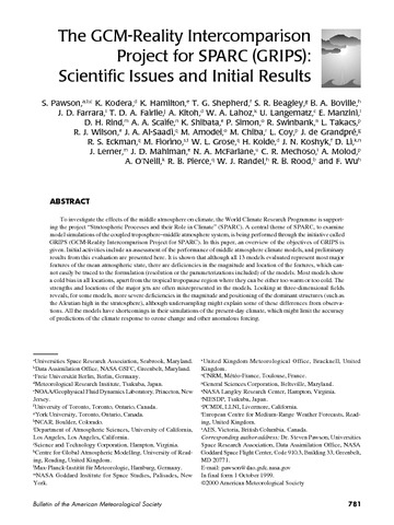 Pawson, S., Kodera, K., Hamilton, K., Shepherd, T. G. orcid id iconORCID: https://orcid.org/0000-0002-6631-9968, Beagley, S. R., Boville, B. A., Farrara, J. D., Fairlie, T. D. A., Kitoh, A., Lahoz, W. A., Langematz, U., Manzini, E., Rind, D. H., Scaife, A. A., Shibata, K., Simon, P., Swinbank, R., Takacs, L., Wilson, R. J., Al-Saadi, J. A., Amodei, M., Chiba, M., Coy, L., de Grandpré, J., Eckman, R. S., Fiorino, M., Grose, W. L., Koide, H., Koshyk, J. N., Li, D., Lerner, J., Mahlman, J. D., McFarlane, N. A., Mechoso, C. R., Molod, A., O'Neill, A., Pierce, R. B., Randel, W. J., Rood, R. B. and Wu, F. (2000) The GCM–Reality Intercomparison Project for SPARC (GRIPS): scientific issues and initial results. Bulletin of the American Meteorological Society, 81 (4). pp. 781-796. ISSN 1520-0477 doi: 10.1175/1520-0477(2000)081<0781:TGIPFS>2.3.CO;2