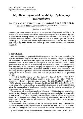 The energy–Casimir method is applied to the problem of symmetric stability in the context of a compressible, hydrostatic planetary atmosphere with a general equation of state. Formal stability criteria for symmetric disturbances to a zonally symmetric baroclinic flow are obtained. In the special case of a perfect gas the results of Stevens (1983) are recovered. Finite-amplitude stability conditions are also obtained that provide an upper bound on a certain positive-definite measure of disturbance amplitude.