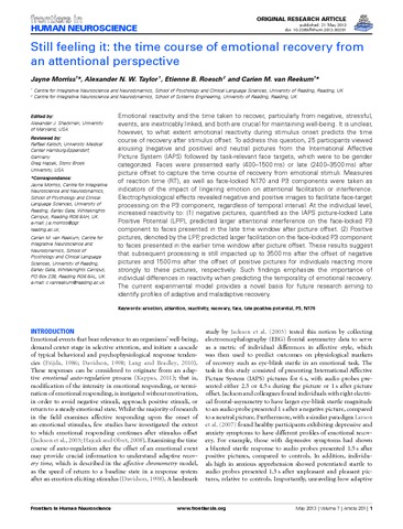 Morriss, J., Taylor, A. N. W., Roesch, E. orcid id iconORCID: https://orcid.org/0000-0002-8913-4173 and Van Reekum, C. orcid id iconORCID: https://orcid.org/0000-0002-1516-1101 (2013) Still feeling it: the time course of emotional recovery from an attentional perspective. Frontiers in Human Neuroscience, 7. 201. ISSN 1662-5161 doi: 10.3389/fnhum.2013.00201