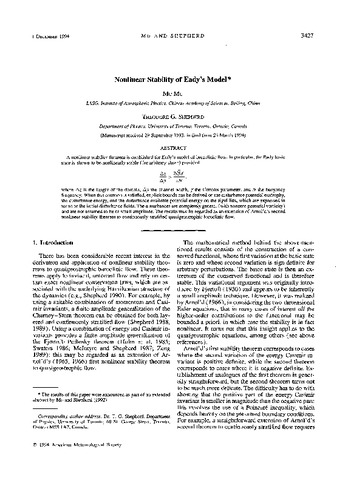 Mu, M. and Shepherd, T. G. orcid id iconORCID: https://orcid.org/0000-0002-6631-9968 (1994) Nonlinear stability of Eady's model. Journal of the Atmospheric Sciences, 51 (23). pp. 3427-3436. ISSN 1520-0469 doi: 10.1175/1520-0469(1994)051<3427:NSOEM>2.0.CO;2