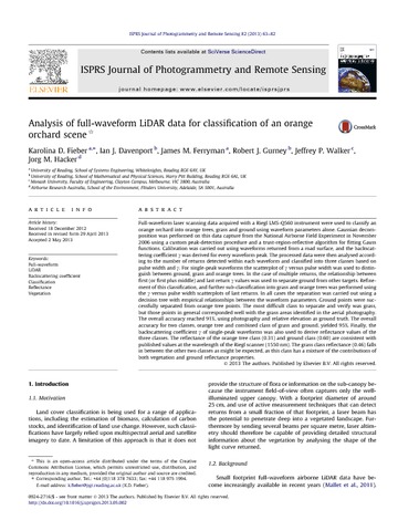 Fieber, K. D., Davenport, I. J., Ferryman, J. M., Gurney, R. J., Walker, J. P. and Hacker, J. M. (2013) Analysis of full-waveform LiDAR data for classification of an orange orchard scene. ISPRS Journal of Photogrammetry and Remote Sensing, 82 (13). pp. 63-82. ISSN 0924-2716 doi: 10.1016/j.isprsjprs.2013.05.002