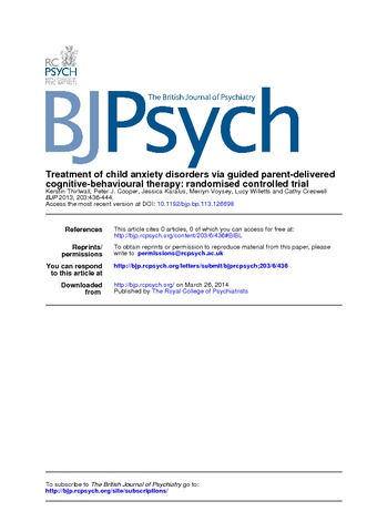 Thirlwall, K., Cooper, P., Karalus, J., Voysey, M., Willetts, L. and Creswell, C. (2013) The treatment of child anxiety disorders via guided parent-delivered cognitive-behavioural therapy: a randomised controlled trial. British Journal of Psychiatry, 203 (6). pp. 436-444. ISSN 1472-1465 doi: 10.1192/bjp.bp.113.126698