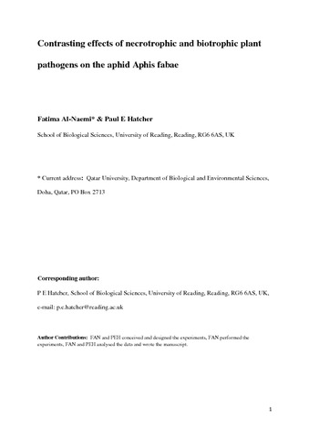 Al-Naemi, F. and Hatcher, P. (2013) Contrasting effects of necrotrophic and biotrophic plant pathogens on the aphid Aphis fabae. Entomologia Experimentalis Et Applicata, 148 (3). pp. 234-245. ISSN 0013-8703 doi: 10.1111/eea.12091