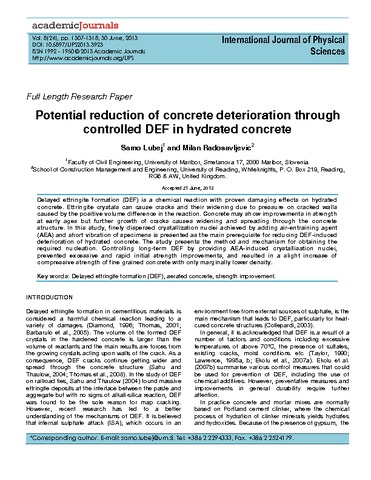 Lubej, S. and Radosavljevic, M. (2013) Potential reduction of concrete deterioration through controlled DEF in hydrated concrete. International Journal of Physical Sciences, 8 (24). pp. 1307-1318. ISSN 1992-1950