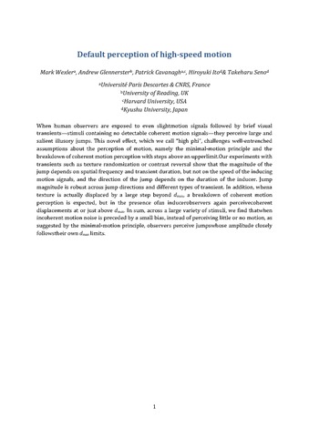 Wexler, M., Glennerster, A. orcid id iconORCID: https://orcid.org/0000-0002-8674-2763, Cavanagh, P., Ito, H. and Seno, T. (2013) Default perception of high-speed motion. Proceedings of the National Academy of Sciences, 110 (17). pp. 7080-7085. ISSN 1091-6490 doi: 10.1073/pnas.1213997110