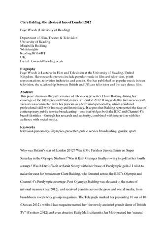 Woods, F. orcid id iconORCID: https://orcid.org/0000-0001-8901-6524 (2013) Clare Balding: the televisual face of London 2012. Journal of Popular Television, 1 (1). pp. 137-141. ISSN 2046-9861 doi: 10.1386/jptv.1.1.137_1
