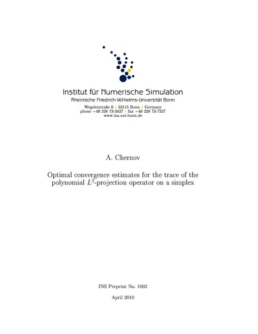 Chernov, A. (2012) Optimal convergence estimates for the trace of the polynomial L2-projection operator on a simplex. Mathematics of Computation, 81 (278). pp. 765-787. ISSN 1088-6842 doi: 10.1090/S0025-5718-2011-02513-5