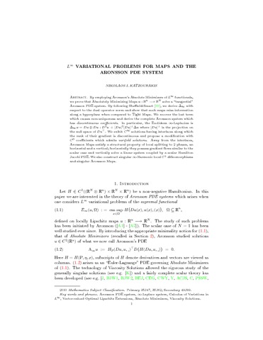 Katzourakis, N. I. (2012) L-Infinity variational problems of maps and the Aronsson PDE system. Journal of Differential Equations, 253 (7). pp. 2123-2139. ISSN 0022-0396 doi: 10.1016/j.jde.2012.05.012