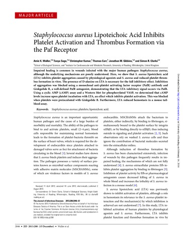 Staphylococcus aureus lipoteichoic acid inhibits platelet activation and thrombus formation via the Paf receptor.