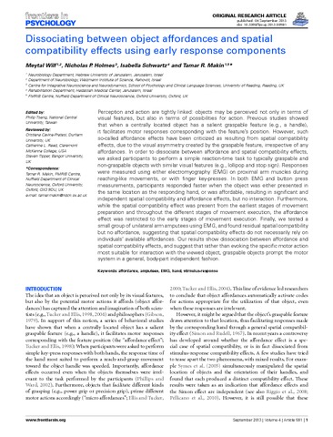 Wilf, M., Holmes, N. P., Schwartz, I. and Makin, T. R. (2013) Dissociating between object affordances and spatial compatibility effects using early response components. Frontiers in Psychology, 4. 591. ISSN 1664-1078 doi: 10.3389/fpsyg.2013.00591