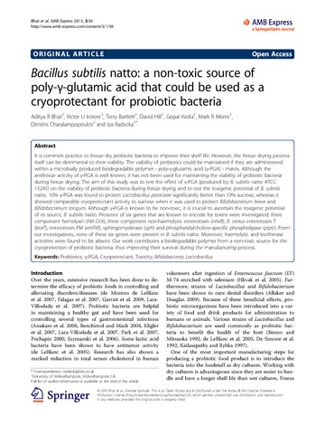 Bhat, A. R., Irorere, V. U., Bartlett, T., Hill, D., Kedia, G., Morris, M. R., Charalampopoulos, D. orcid id iconORCID: https://orcid.org/0000-0003-1269-8402 and Radecka, I. (2013) Bacillus subtilis natto: a non-toxic source of poly-γ-glutamic acid that could be used as a cryoprotectant for probiotic bacteria. AMB Express, 3 (1). p. 36. ISSN 2191-0855 doi: 10.1186/2191-0855-3-36