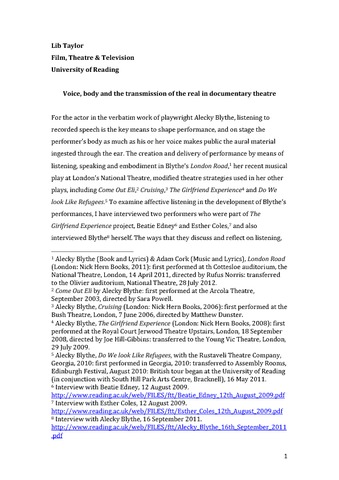 Taylor, L. (2013) Voice, body and the transmission of the real in documentary theatre. Contemporary Theatre Review, 23 (3). pp. 368-379. ISSN 1477-2264 doi: 10.1080/10486801.2013.806318