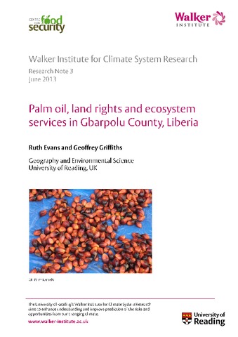 Evans, R. orcid id iconORCID: https://orcid.org/0000-0002-4599-5270 and Griffiths, G., (2013) Palm oil, land rights and ecosystem services in Gbarpolu County, Liberia. Research Note. 3. Walker Institute for Climate System Research, University of Reading, Reading.