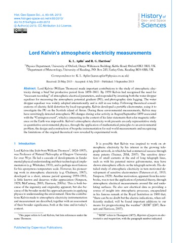 Lord Kelvin (William Thomson) made important contributions to the study of atmospheric elec- tricity during a brief but productive period from 1859–1861. By 1859 Kelvin had recognised the need for “incessant recording” of atmospheric electrical parameters, and responded by inventing both the water dropper equaliser for measuring the atmospheric potential gradient (PG), and photographic data logging. The water dropper equaliser was widely adopted internationally and is still in use today. Following theoretical consid- erations of electric field distortion by local topography, Kelvin developed a portable electrometer, using it to investigate the PG on the Scottish island of Arran. During these environmental measurements, Kelvin may have unwittingly detected atmospheric PG changes during solar activity in August / September 1859 associated with the “Carrington event”, which is interesting in the context of his later statements that solar magnetic influ- ence on the Earth was impossible. Kelvin’s atmospheric electricity work presents an early representative study in quantitative environmental physics, through the application of mathematical principles to an environmental problem, the design and construction of bespoke instrumentation for real world measurements and recognising the limitations of the original theoretical view revealed by experimental work