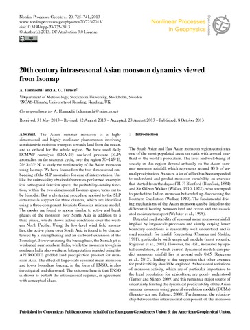 Hannachi, A. and Turner, A. G. orcid id iconORCID: https://orcid.org/0000-0002-0642-6876 (2013) 20th century intraseasonal Asian monsoon dynamics viewed from Isomap. Nonlinear Processes in Geophysics, 20 (5). pp. 725-741. ISSN 1607-7946 doi: 10.5194/npg-20-725-2013