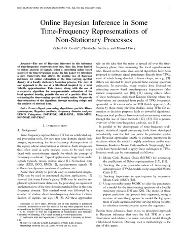 Everitt, R. G., Andrieu, C. and Davy, M. (2013) Online bayesian inference in some time-frequency representations of non-stationary processes. IEEE Transactions on Signal Processing, 61 (22). pp. 5755-5766. ISSN 1053-587X doi: 10.1109/TSP.2013.2280128