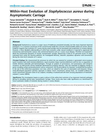 Golubchik, T., Batty, E. M., Miller, R. R., Farr, H., Young, B. C., Larner-Svensson, H., Fung, R., Godwin, H., Knox, K., Votintseva, A., Everitt, R. G., Street, T., Cule, M., Ip, C. L. C., Didelot, X., Peto, T. E. A., Harding, R. M., Wilson, D. J., Crook, D. W. and Bowden, R. (2013) Within-host evolution of Staphylococcus aureus during asymptomatic carriage. PLoS ONE, 8 (5). e61319. ISSN 1932-6203 doi: 10.1371/journal.pone.0061319