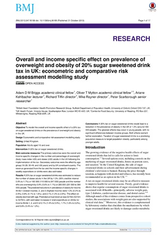 Briggs, A. D. M., Mytton, O. T., Kehlbacher, A., Tiffin, R., Rayner, M. and Scarborough, P. (2013) Overall and income specific effect on prevalence of overweight and obesity of 20% sugar sweetened drink tax in UK: econometric and comparative risk assessment modelling study. British Medical Journal, 347. f6189. ISSN 1468-5833 doi: 10.1136/bmj.f6189