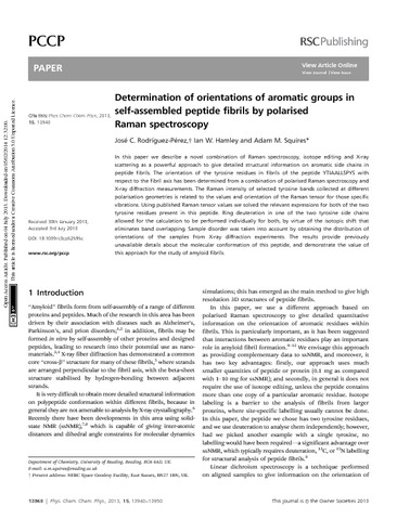 Rodrıguez-Perez, J. C., Hamley, I. W. orcid id iconORCID: https://orcid.org/0000-0002-4549-0926 and Squires, A. M. (2013) Determination of orientations of aromatic groups in self-assembled peptide fibrils by polarised Raman spectroscopy. Physical Chemistry Chemical Physics, 33 (15). pp. 13940-13950. ISSN 1463-9076 doi: 10.1039/c3cp52595c
