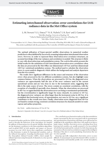 Stewart, L. M., Dance, S. L. orcid id iconORCID: https://orcid.org/0000-0003-1690-3338, Nichols, N. K. orcid id iconORCID: https://orcid.org/0000-0003-1133-5220, Eyre, J. R. and Cameron, J. (2014) Estimating interchannel observation-error correlations for IASI radiance data in the Met Office system. Quarterly Journal of the Royal Meteorological Society, 140 (681). pp. 1236-1244. ISSN 1477-870X doi: 10.1002/qj.2211