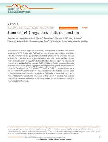 Vaiyapuri, S. orcid id iconORCID: https://orcid.org/0000-0002-6006-6517, Moraes, L. A., Sage, T., Ali, M. S., Lewis, K. R., Mayhaut-Smith, M. P., Oviedo-Orta, E., Simon, A. M. and Gibbins, J. M. orcid id iconORCID: https://orcid.org/0000-0002-0372-5352 (2013) Connexin40 regulates platelet function. Nature Communications, 4. pp. 2564-2572. ISSN 2041-1723 doi: 10.1038/ncomms3564