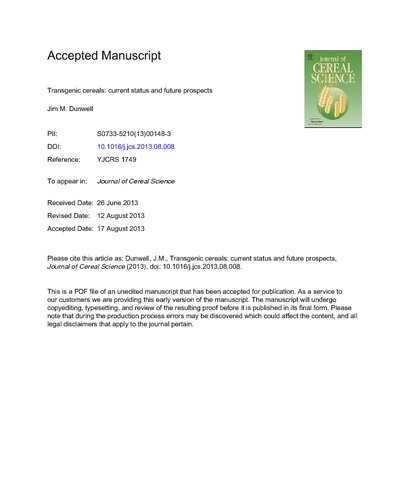 Dunwell, J. M. orcid id iconORCID: https://orcid.org/0000-0003-2147-665X (2014) Transgenic cereals: current status and future prospects. Journal of Cereal Science, 59 (3). pp. 419-434. ISSN 0733-5210 doi: 10.1016/j.jcs.2013.08.008