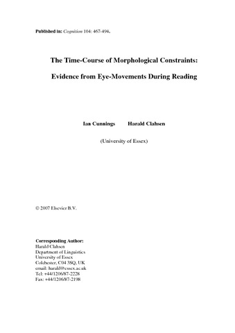 Cunnings, I. orcid id iconORCID: https://orcid.org/0000-0002-5318-0186 and Clahsen, H. (2007) The time-course of morphological constraints: Evidence from eye-movements during reading. Cognition, 104 (3). pp. 476-494. ISSN 0010-0277 doi: 10.1016/j.cognition.2006.07.010