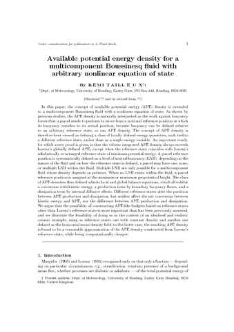 Tailleux, R. orcid id iconORCID: https://orcid.org/0000-0001-8998-9107 (2013) Available potential energy density for a multicomponent Boussinesq fluid with arbitrary nonlinear equation of state. Journal of Fluid Mechanics, 735. pp. 499-518. ISSN 0022-1120 doi: 10.1017/jfm.2013.509