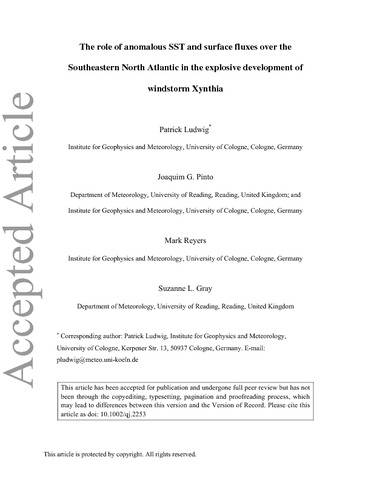 Ludwig, P., Pinto, J. G., Reyers, M. and Gray, S. L. orcid id iconORCID: https://orcid.org/0000-0001-8658-362X (2014) The role of anomalous SST and surface fluxes over the Southeastern North Atlantic in the explosive development of windstorm Xynthia. Quarterly Journal of the Royal Meteorological Society, 140 (682). pp. 1729-1741. ISSN 1477-870X doi: 10.1002/qj.2253